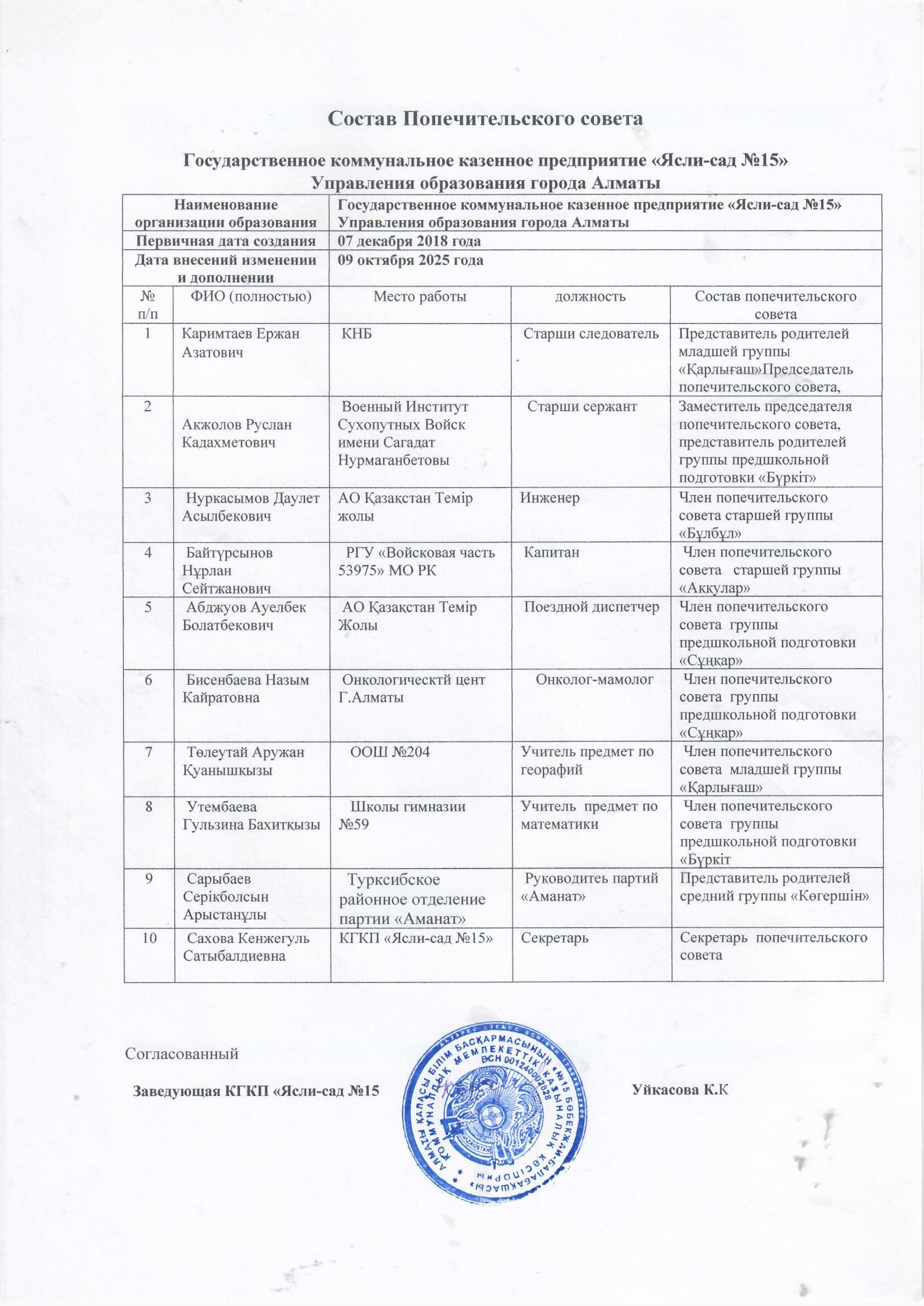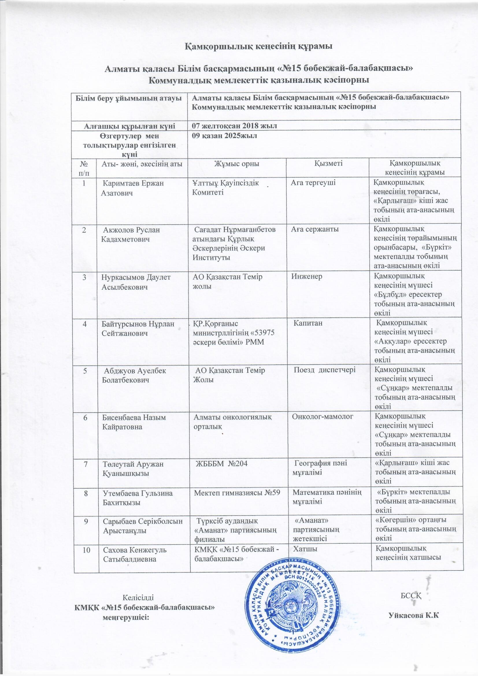 №15 балабақшадағы білім беру ұйымдары қамқоршылық кеңесінің құрамы
